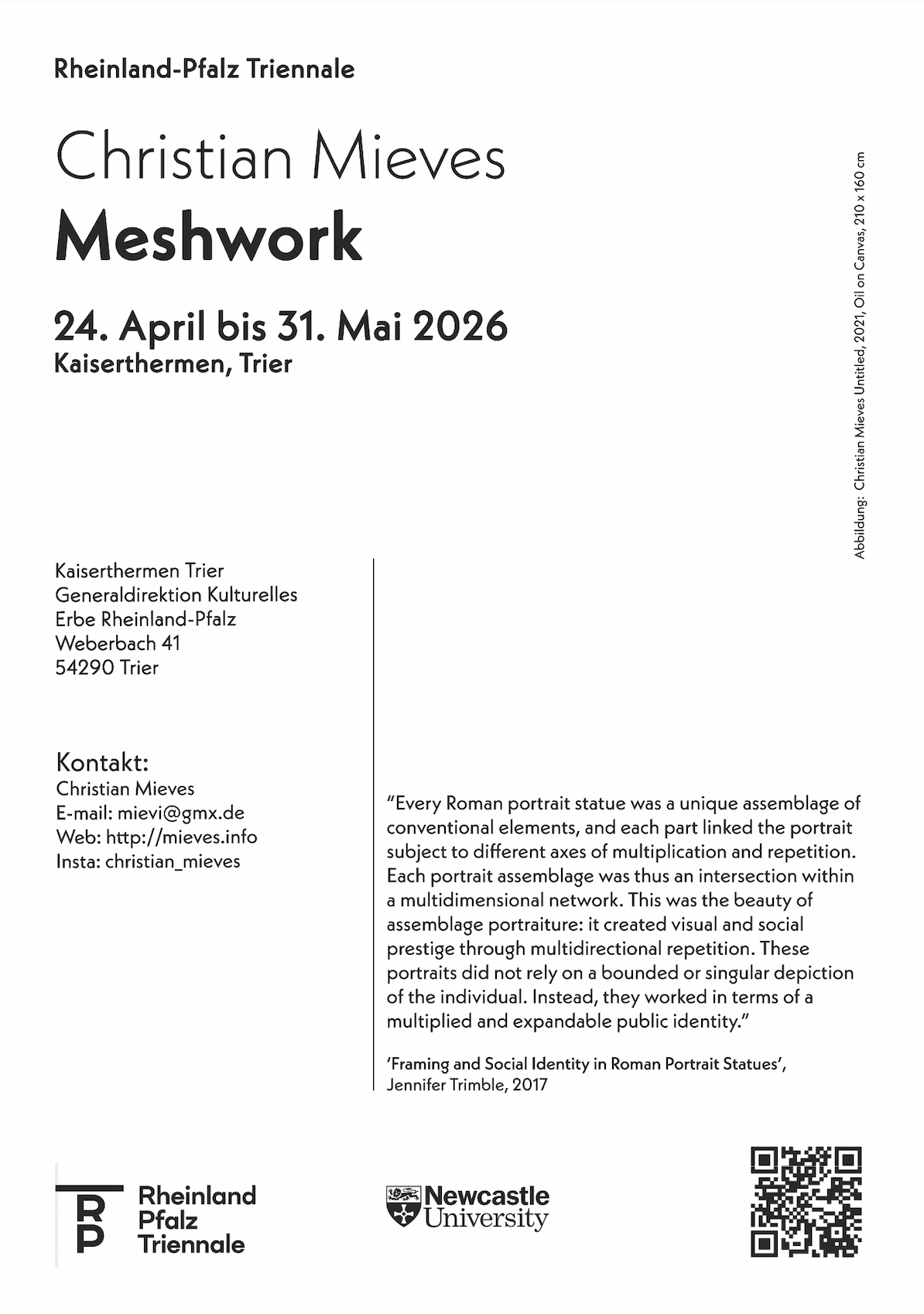 I am very excited to be selected amongst other amazing artists for the Rheinland-Pfalz Triennale 2026 in Trier, Germany. The Exhibition with a largescale installation will be from 24. April bis 31. Mai 2026. Please see link for further information.